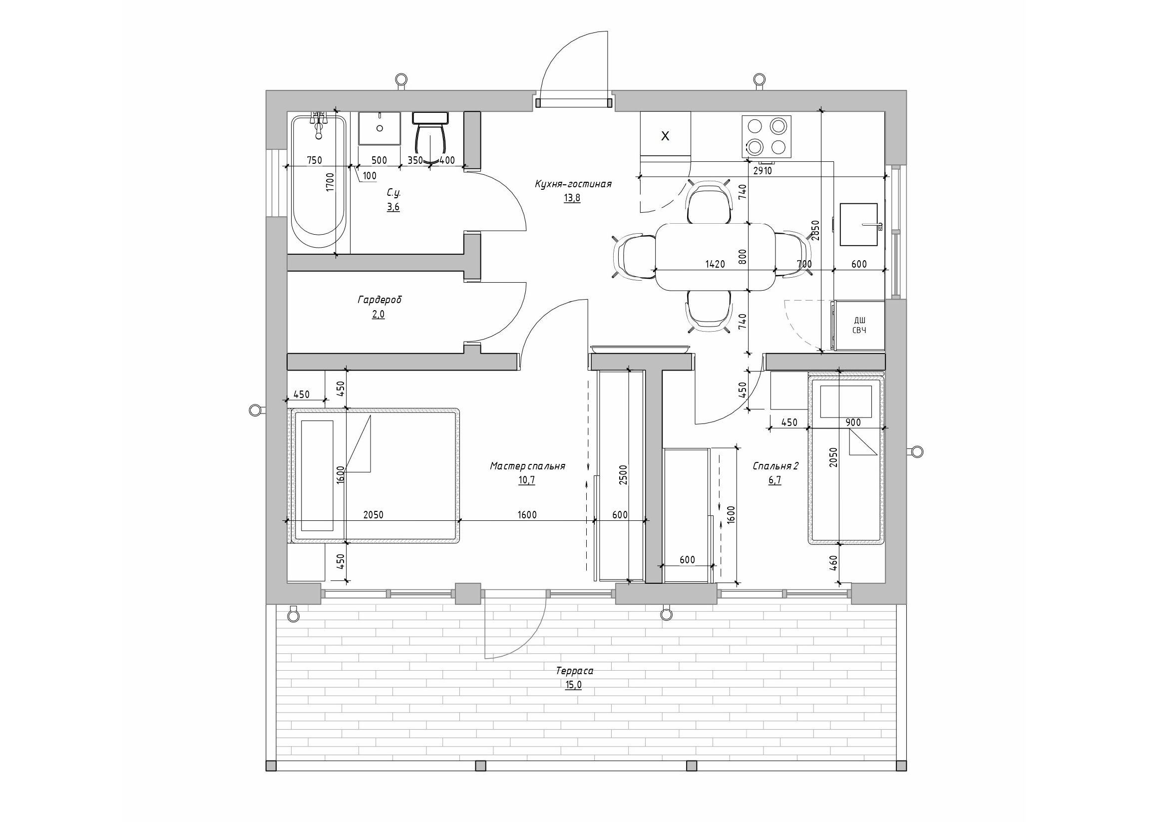 Функциональное зонирование: просторная кухня-гостиная с обеденной зоной, две изолированные спальни и полноценный санузел. Идеальное решение для небольшой семьи, дачного участка или комфортного загородного отдыха.