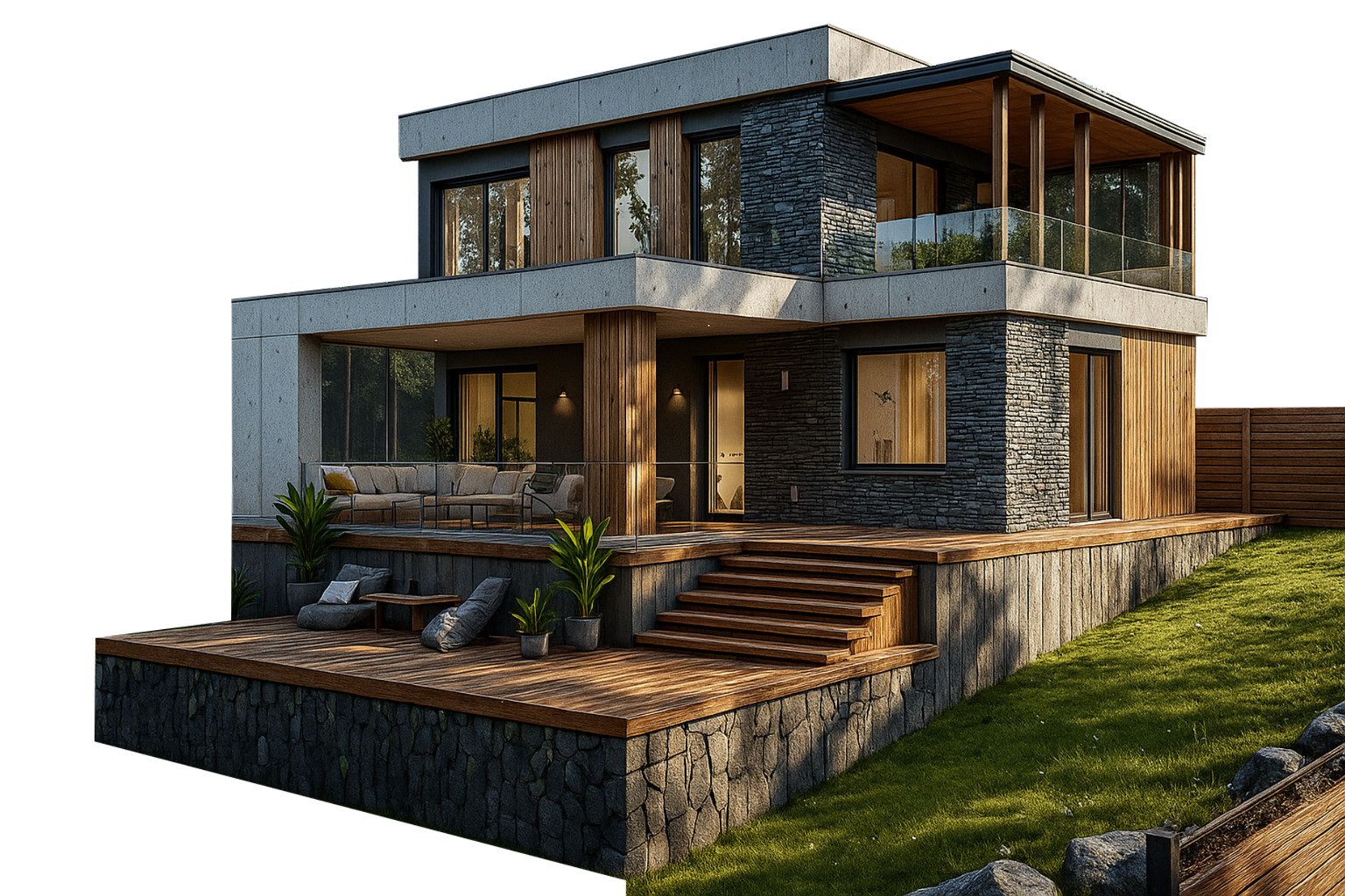 Архитектура дома выполнена в скандинавском стиле: строгая геометрия, светлая отделка фасада, панорамные окна и акцентные элементы из дерева и металла. Просторная терраса и вторая зона отдыха на втором этаже позволяют наслаждаться природой, не покидая пределы участка.