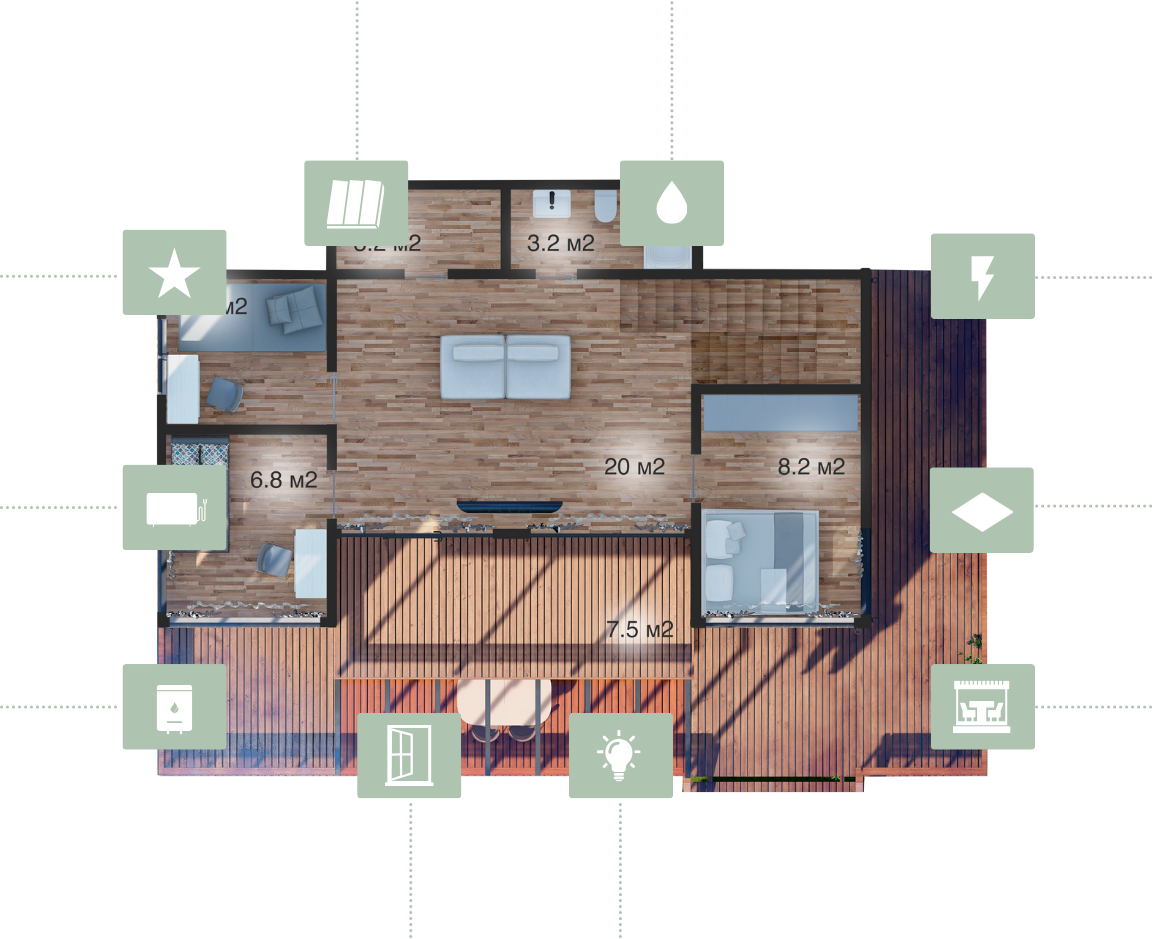 2 ЭТАЖ — КУХНЯ-ГОСТИНАЯ, БАНЯ И ТЕРРАСА